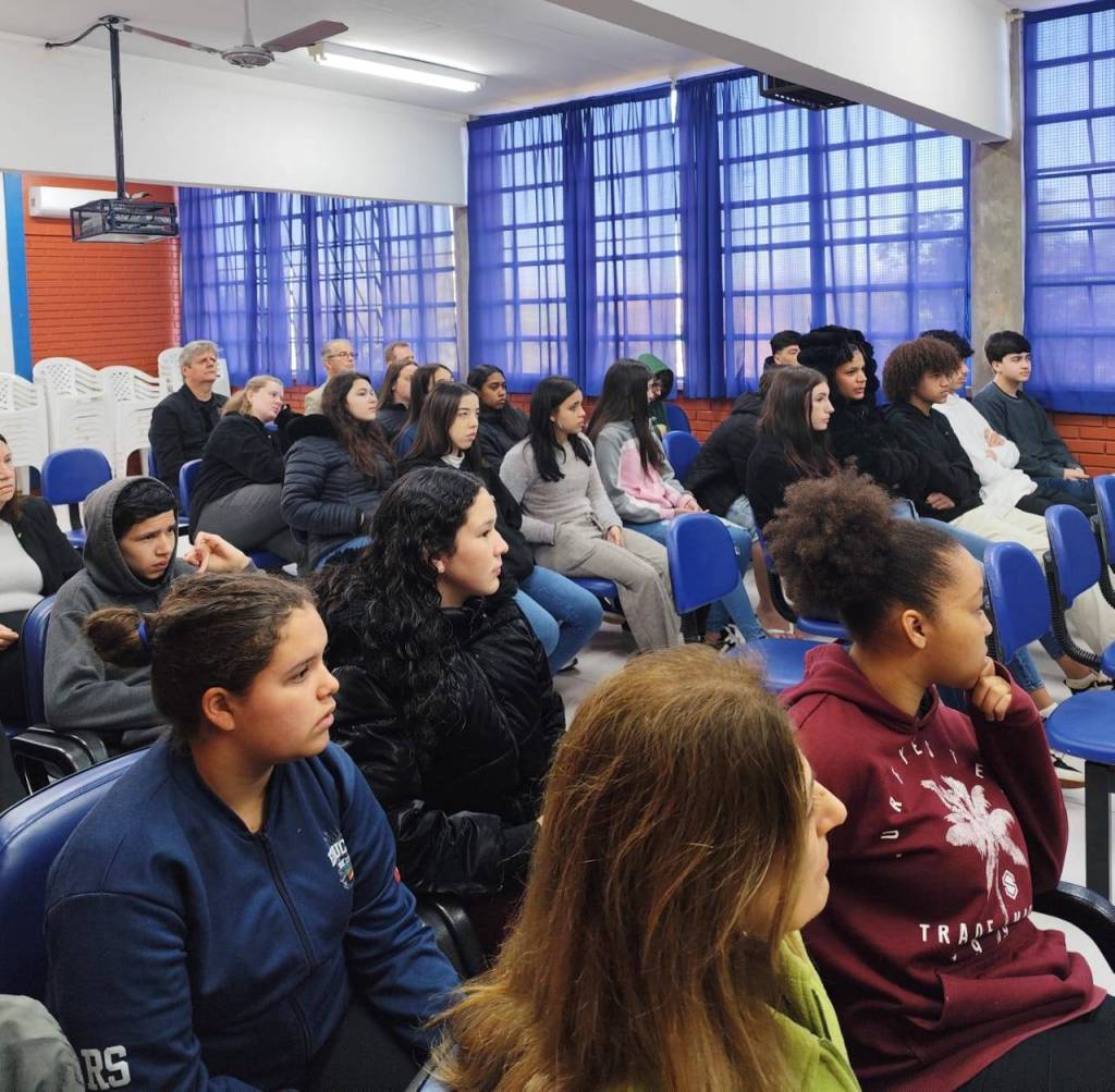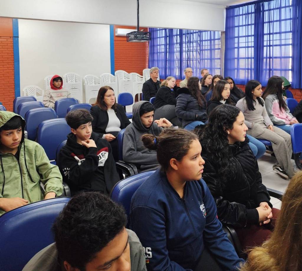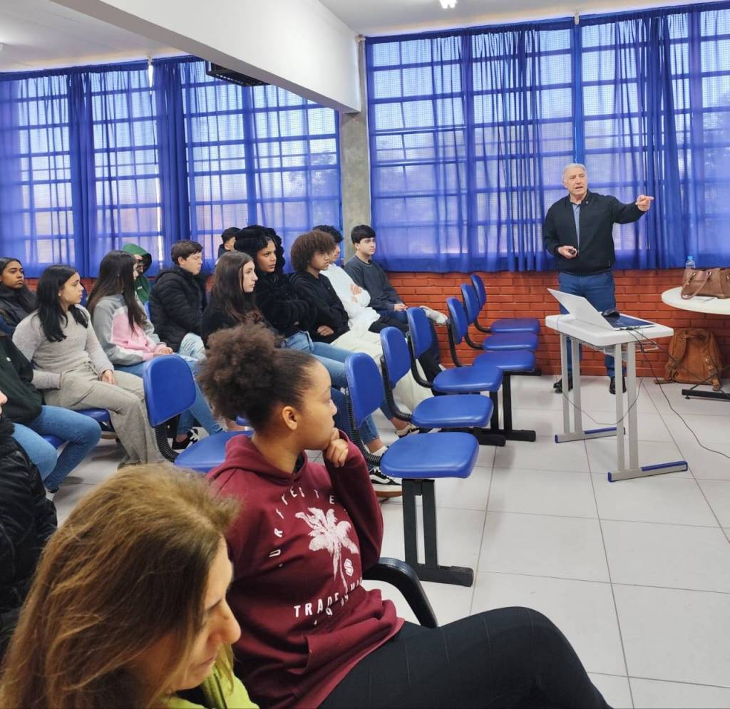 1ª Dia de interação na Escola Estadual de Ensino Médio Santo Antônio, que tivemos a apresentação pelo companheiro Luiz Celeste de Roque Fassina com um tema motivacional e de conscientização dos alunos em relação da realização dos seus projetos de vida.