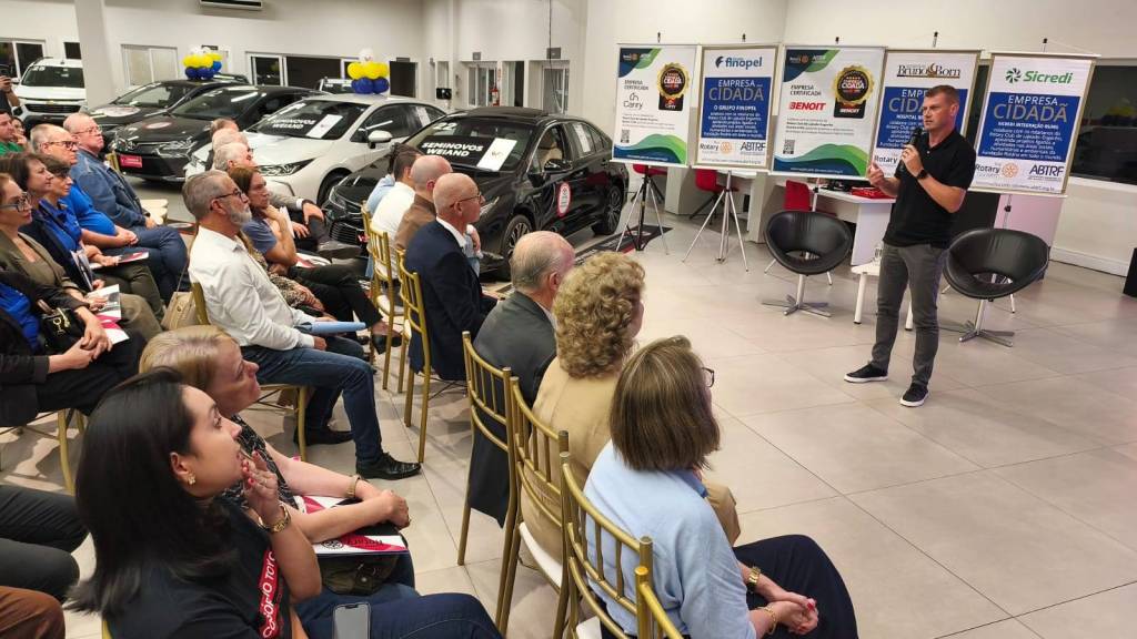 Por fim, houve o depoimento do diretor do Hospital Bruno Born, Cristiano Dieckel, que falou da importância das ações do Rotary para a instituição, a qual foi beneficiada no ano de 2019 e 2022 com projetos de subsídio global. Deu grande destaque para o projeto de 2019, o qual doou 12 monitores para a UTI adulto, no valor de 56 mil dólares. Enfatizou que tais equipamentos salvaram milhares de vidas, considerando que logo após veio a pandemia do covid. O depoimento teve grande impacto perante os presentes e serviu também para sensibilizar as empresas participantes da importância de participar dos projetos do Rotary.