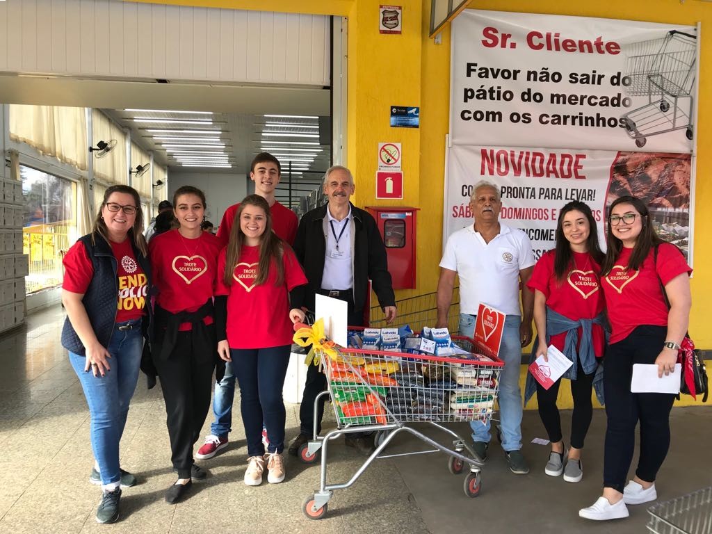 No último sábado, 4 de agosto, nosso Clube participou do Trote Solidário que é um projeto do SIMERS juntamente com os alunos da medicina da UNIVATES. A ação ocorreu nos supermercados IMEC do Centro, Florestal e São Cristóvão, nos mercados da Rede Super BR 386 e Bairro Praia e também no Supermercado STR no centro de Lajeado. Foram arrecadados um total de 3.350 kg de alimentos não perecíveis e materiais de higiene e limpeza. Tudo que foi arrecadado será destinado a quem mais precisa.
