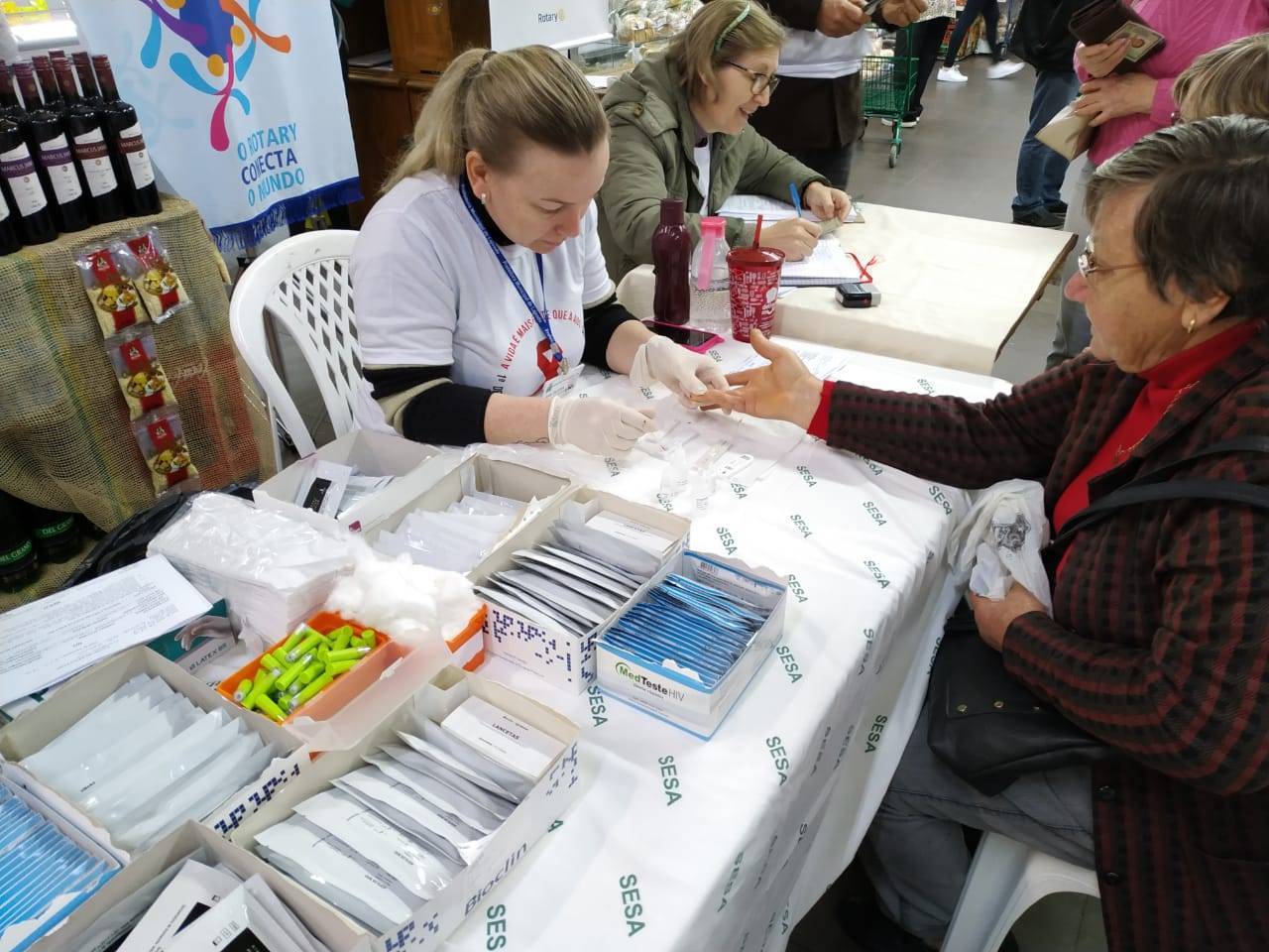 Por iniciativa do Rotary Club de Lajeado-Engenho, com a participação da Secretaria Municipal de Saúde de Lajeado, tendo como empresa parceira o Supermercado STR, foi realizado na sexta-feira, dia 02/08, a aplicação de 150 testes rápidos para detecção da Hepatite B e C, HIV e Sifilis. A atividade ocorreu no interior da unidade do STR do centro de Lajeado, por ser um espaço de grande circulação de pessoas.